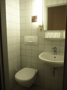 流れのよろしくないトイレ。謎のステッカーが貼ってある。